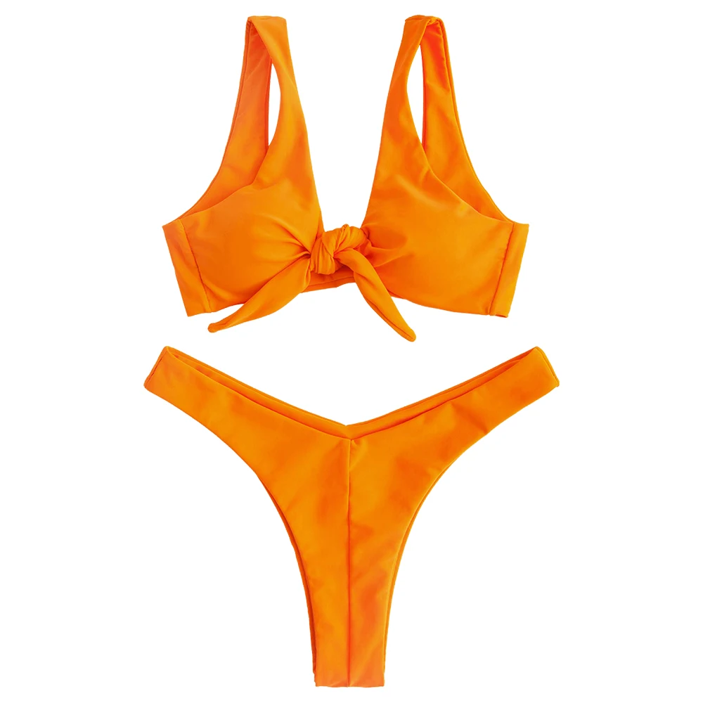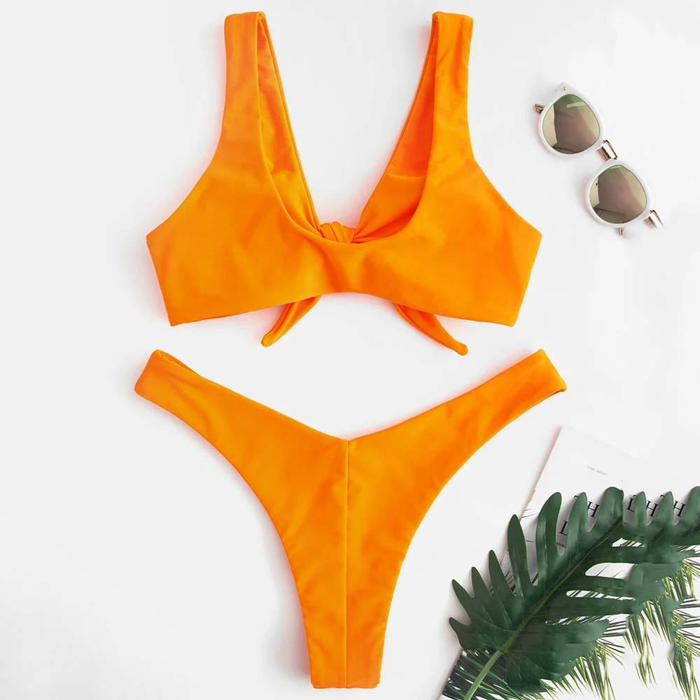 Good Price for ZAFUL Knotted Padded Thong Bikini Swimwear Women Mid Waisted Solid Scoop Neck Brazilian Swimsuit Be